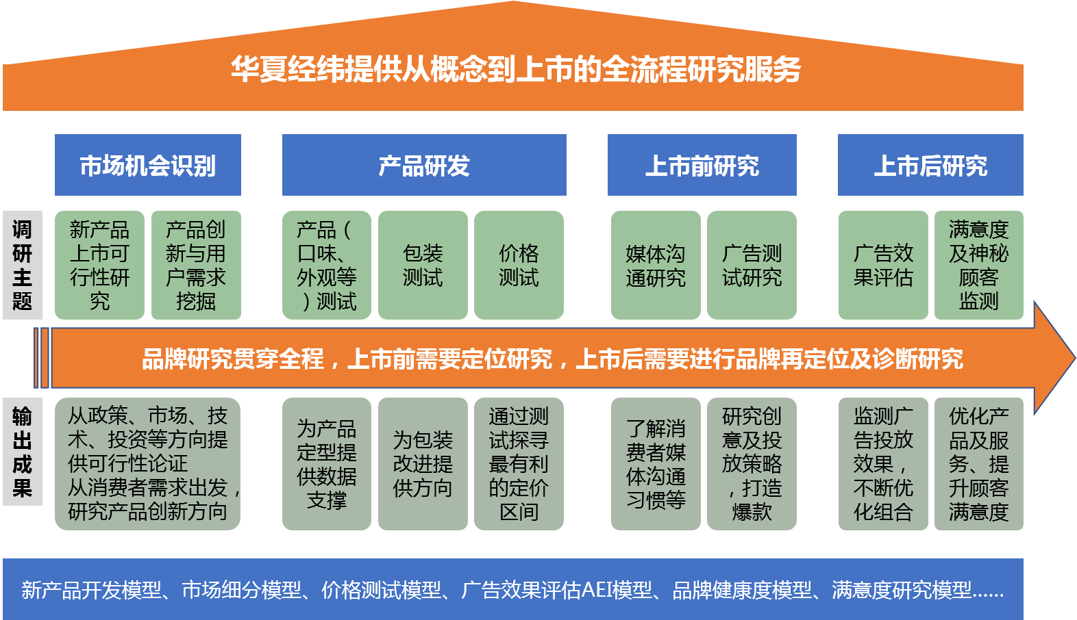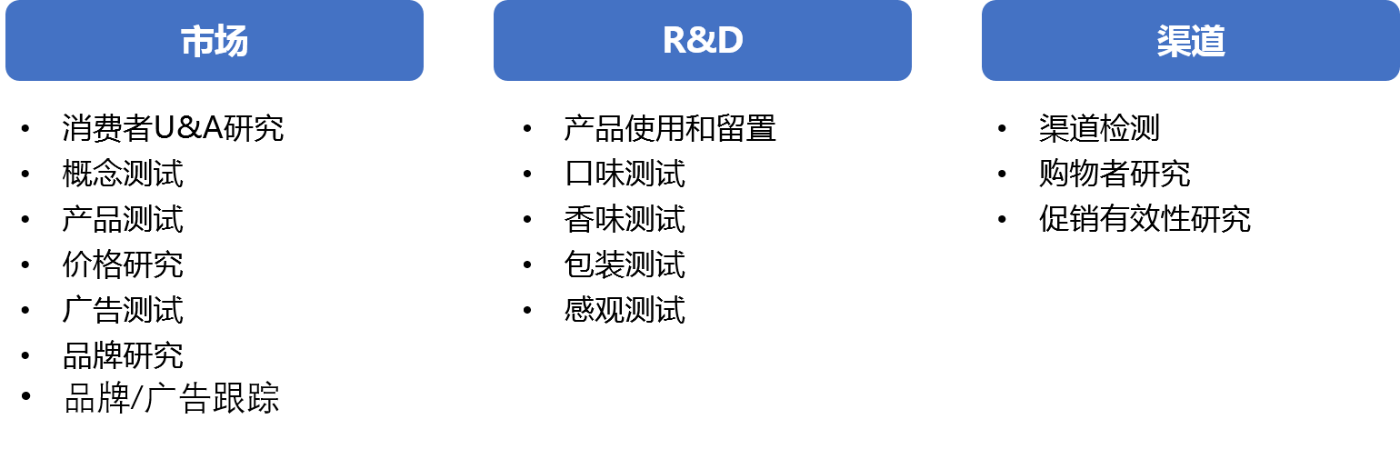消費品(快消品)研究包含可行性研究、消費者U&A研究、概念測試、市場細分研究、產品測試、新產品創新開發、品牌研究及品牌定位、品牌評估與傳播、廣告及活動效果評估、服務滿意度研究、渠道監測等等。華夏經緯研究團隊提供新產品從機會識別到上市、量產及升級的全流程服務。